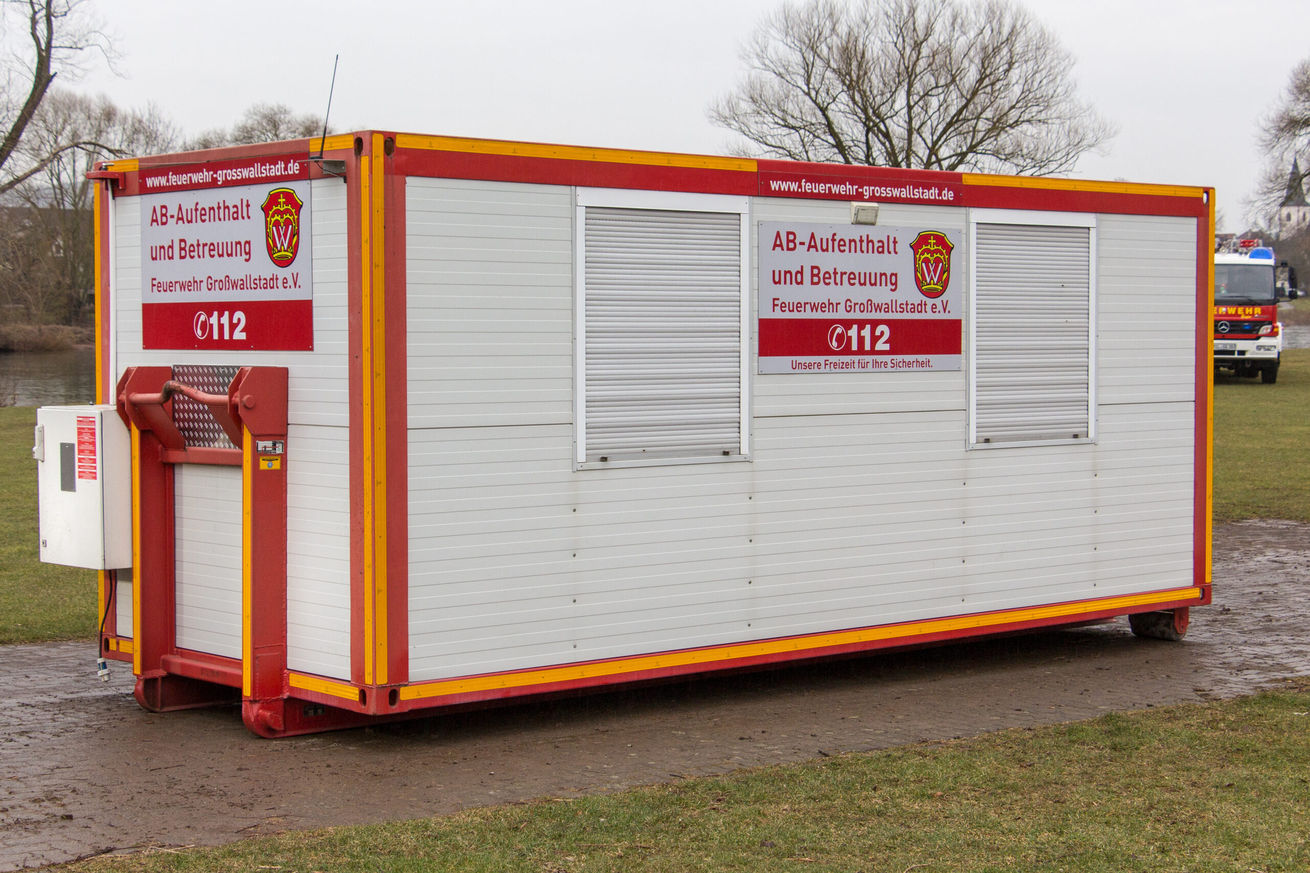 AB-Aufenthalt Technische Daten:Fahrzeugtyp: Abrollbehälter Aufenthalt/EinsatzleitungRufname: Florian Großwallstadt 12/1Hersteller: Containerbau Hameln Aufbau: EigenumbauBaujahr: 2013Ausstattung: Umfeldbeleuchtung, Notbeleuchtung 12 V, Heizung, Stromgenerator, Funkgerät Analog und Digital