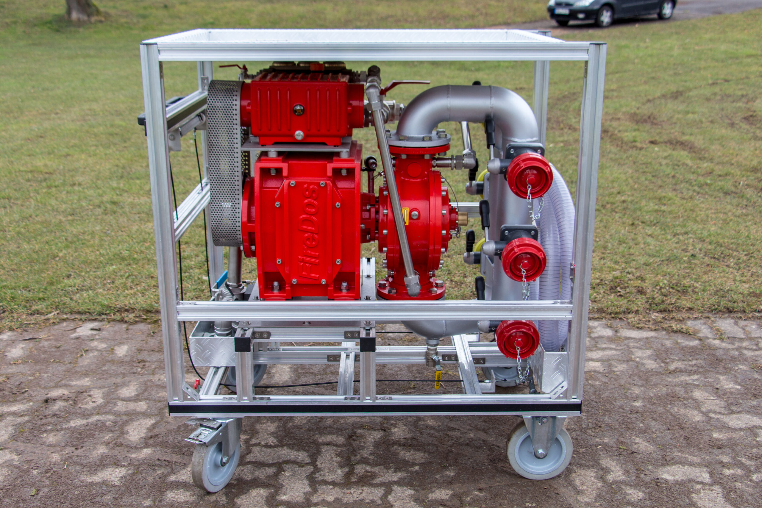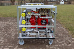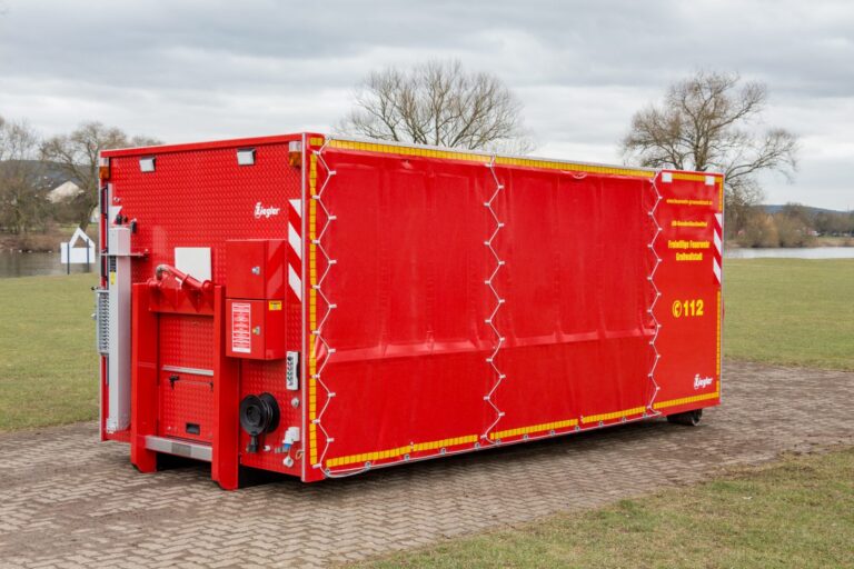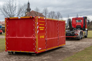 Ausstattung: 4 mal 1000 Liter Schaummittel in IBC, 600 Liter Schaummittel in Kanistern auf zwei Rollwagen, 4 mal 12kg Metallbrandpulverlöscher, 2 mal 50kg Pulverlöscher, fahrbar, 4 mal 30kg CO2 Löscher, fahrbar, Fire-Dos Schaumzumischung, FD2500, Lichtmast,, Umfeldbeleuchtung
